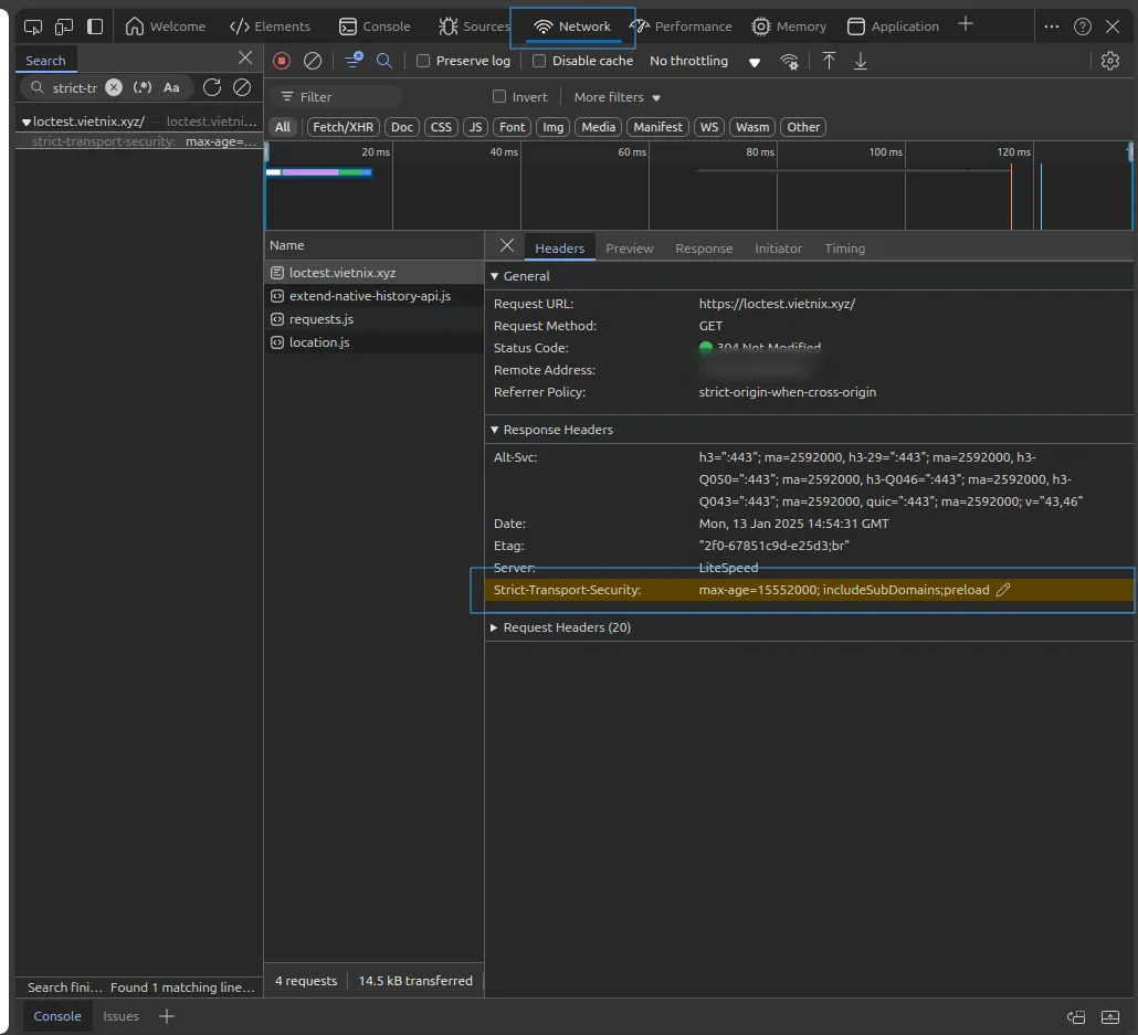 Bạn mở website trên trình duyệt bất kỳ và bấm F12 để mở Developer Tools. Sau đó, bạn vào mục Network, tìm một file liên quan đến domain của bạn (ví dụ: abc.xyz) và xem phần Headers. Bạn sẽ thấy cấu hình vHost đã được thêm vào phần Response Header.