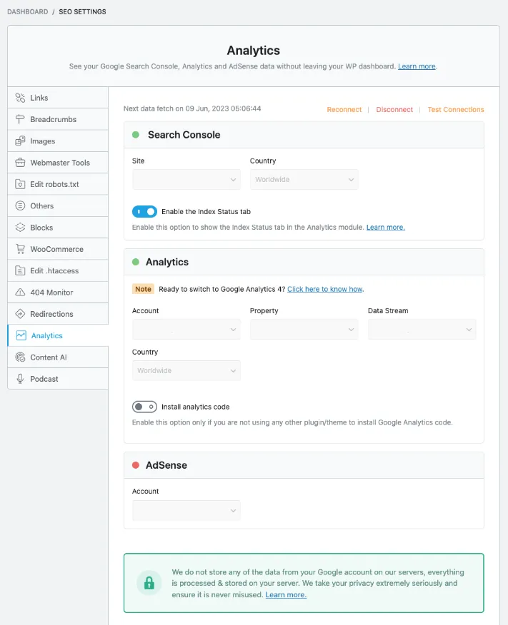 Sau khi bạn đã kết nối và cấu hình xong các cài đặt phân tích, Rank Math sẽ bắt đầu tự động lấy dữ liệu từ Google để hiển thị trong dashboard WordPress của bạn. Nếu bạn thấy việc hiển thị dữ liệu chậm hoặc bị lỗi, bạn có thể kiểm tra tình trạng kết nối bằng cách nhấn vào nút Test Connections nằm ở góc trên bên phải của phần cài đặt Analytics.