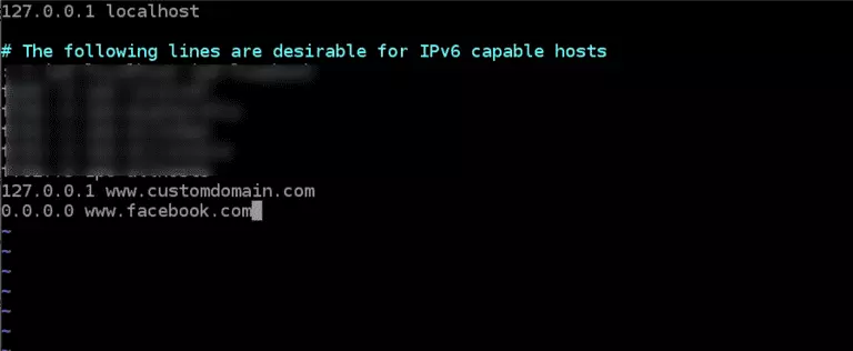 Bước 2: Chỉnh sửa file host trong Linux tương tự như trong Window. Bây giờ chúng ta đang chặn facebook.com và một miền tùy chỉnh.
