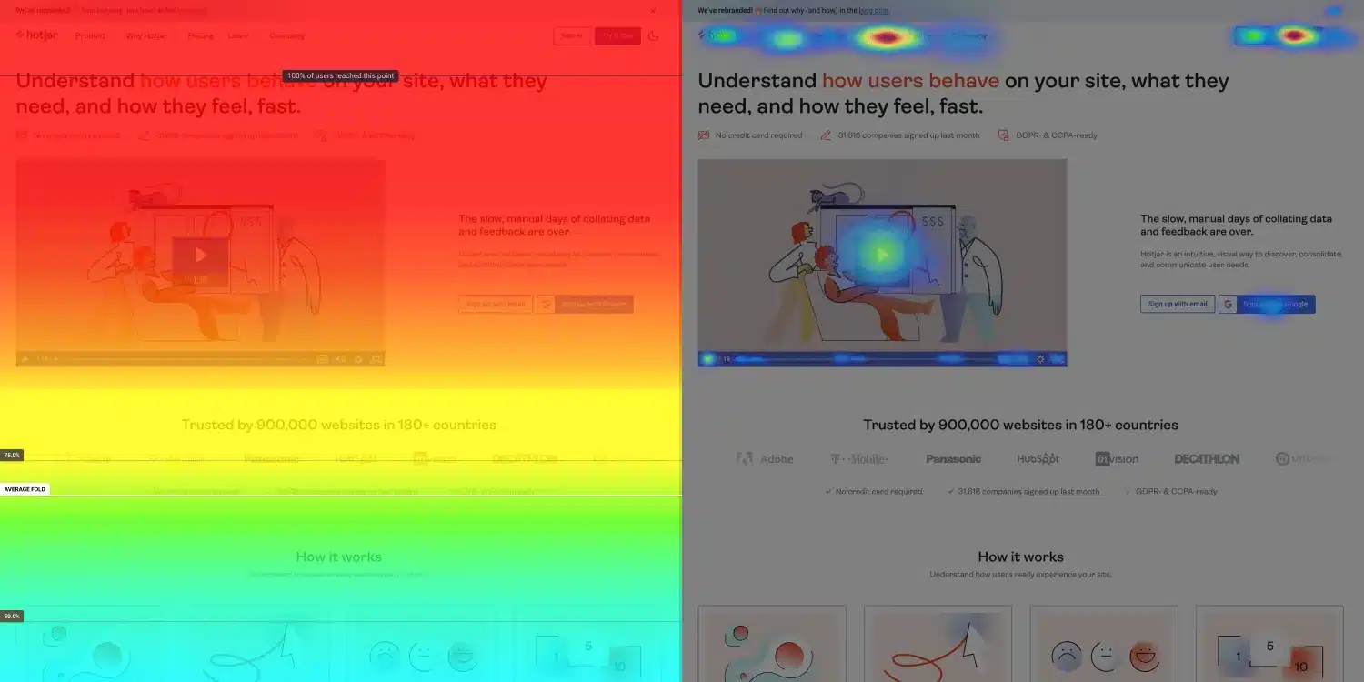 Heatmap này giúp so sánh hiệu suất của website trên 2 thiết bị khác nhau. Ví dụ, nội dung của một trang có thể chỉ hiển thị phần đầu của giao diện desktop, nhưng trên giao diện di động thì nó xuất hiện khi người dùng kéo xuống dưới. Bằng cách so sánh tương tác trên hai giao diện này, bạn có thể hiểu được lý do đằng sau.