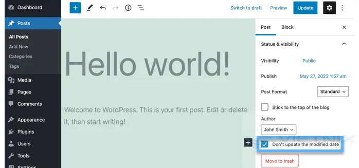 Sau khi kích hoạt, lúc chỉnh sửa bài viết, bạn sẽ thấy một hộp kiểm mới. Hộp kiểm này có nhãn “Don’t update the modified date”. Khi bạn thực hiện một cập nhật nhỏ cho một bài viết, chỉ cần đánh dấu vào ô kiểm đó và ngày sửa đổi sẽ không được thay đổi.