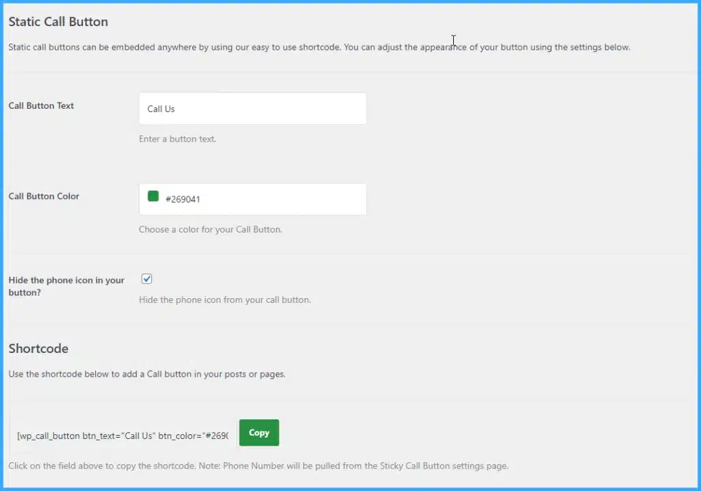 Phần Stactic Call Button để thiết lập shortcode chèn thủ công, trong đó: