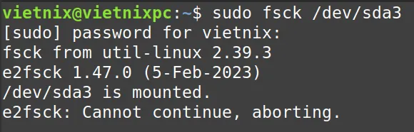 sudo fsck -f /dev/sda2Kết quả: Lệnh fsck sẽ kiểm tra kỹ lưỡng file sda2 và sửa chữa mọi lỗi, kể cả lỗi nhỏ.
