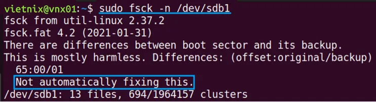sudo fsck -n /dev/sdb1Kết quả: Lệnh sẽ hiển thị thông tin về lỗi được phát hiện trên file /dev/sdb1 nhưng không tự động sửa chữa.