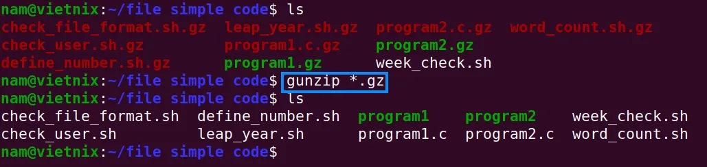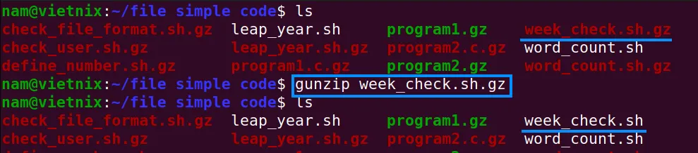 gunzip leap_year.sh.gz word_count.sh.gzBạn có thể thay leap_year.sh.gz và word_count.sh.gz bằng tên các file nén mà bạn muốn giải nén.