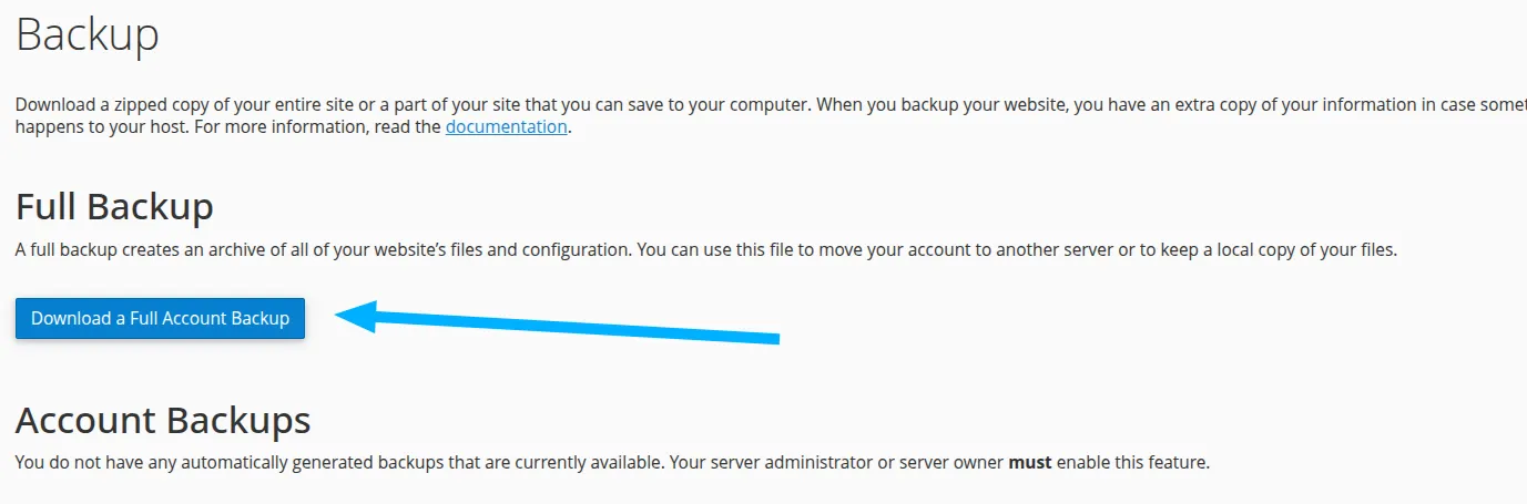 Sau đó, bạn chọn Download a Full Account Backup để tiến hành thiết lập và tạo tệp full backup cPanel: