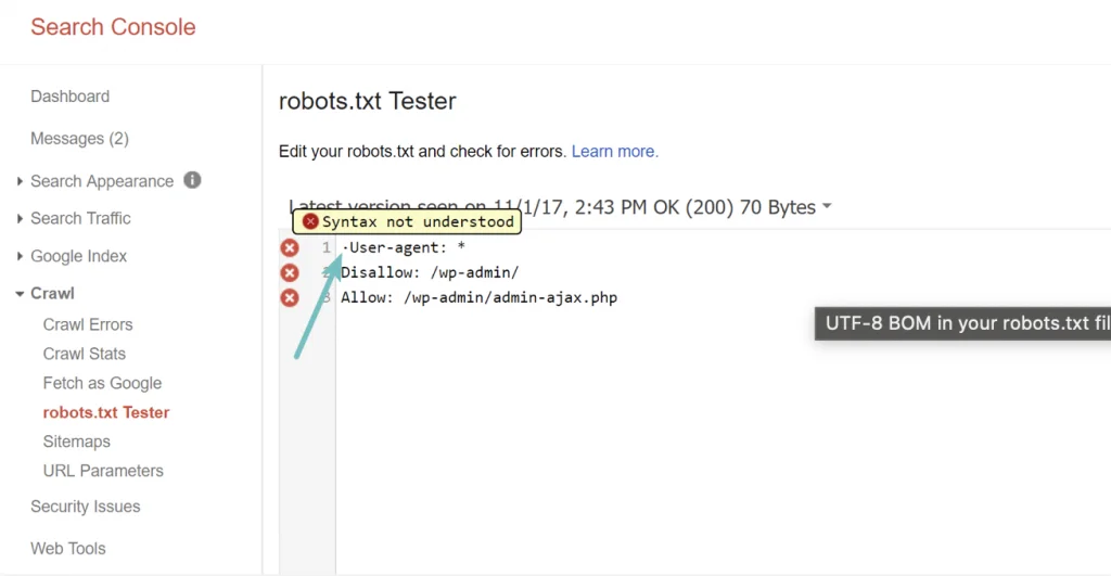 BOM là viết tắt của “byte order mark” (dấu thứ tự byte). Về cơ bản, nó là một ký tự vô hình, đôi khi được thêm vào các file bởi các text editor cũ. Khi đó, Google có thể không đọc các file robots.txt một cách chính xác. Do đó, cần phải kiểm tra các file cẩn thận để tòm ra lỗi. Quan sát ví dụ ở dưới, file của chúng tôi đã có một kí tự ẩn, và Google không thể hiểu được cú pháp. Về cơ bản thì dòng đầu tiên trong file robots.txt mất hiệu lực hoàn toàn. Do đó, SEO của trang web có thể bị ảnh hưởng xấu.