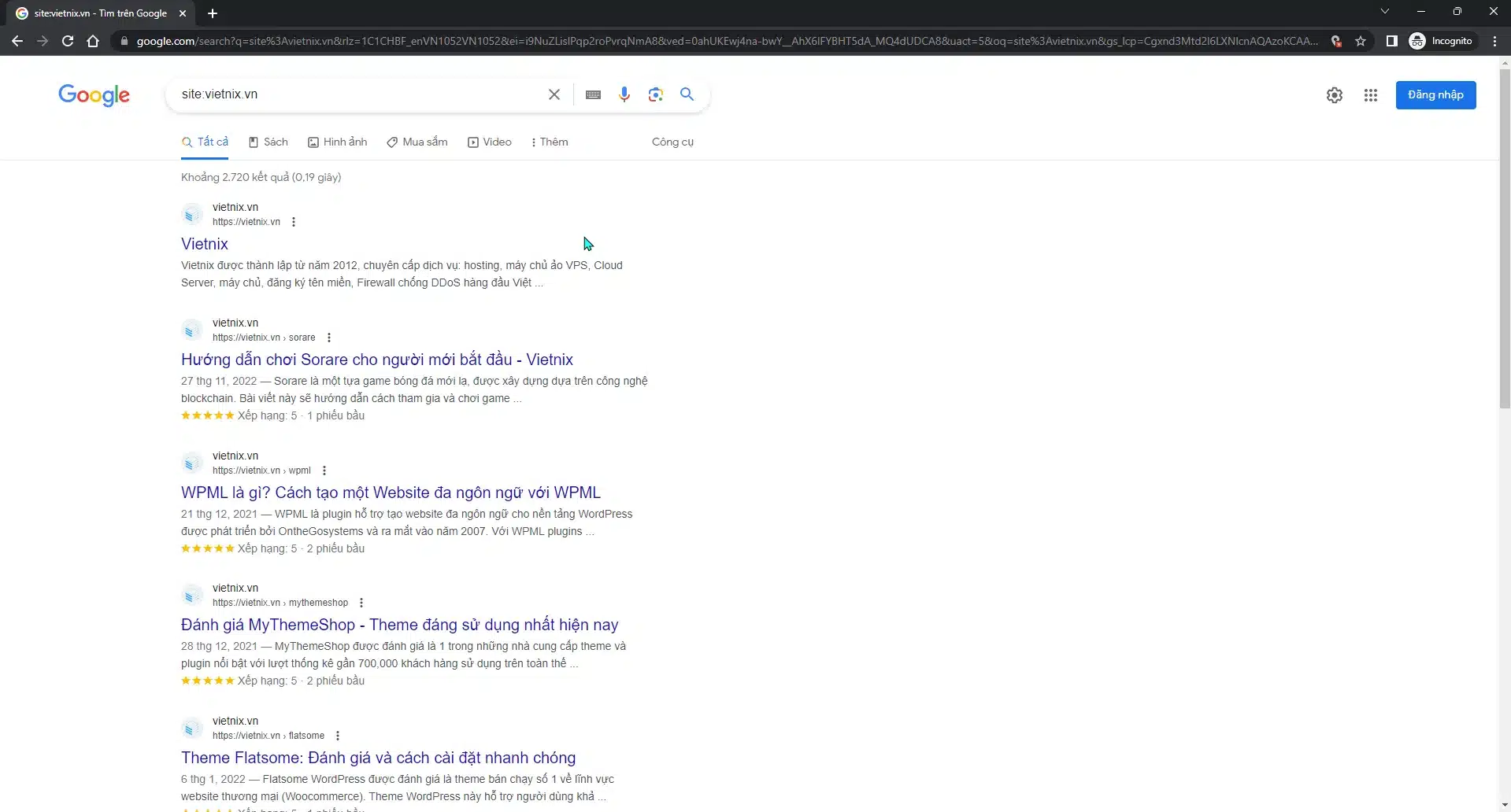 Truy cập vào Google, nhập cú pháp site:tenmiencuaban (ví dụ: site:vietnix.vn) trên thanh tìm kiếm. Nếu không có kết quả trả về nghĩa là website chưa được index. Trường hợp bạn vừa thực hiện submit website thì Google vẫn chưa kịp index nên cũng sẽ không xuất hiện trên kết quả tìm kiếm.